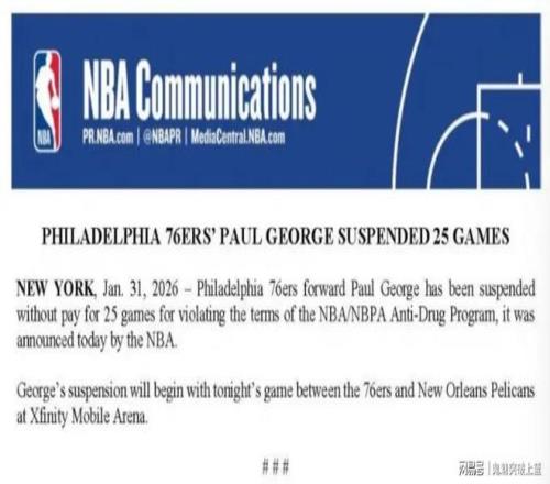 北京时间2月1报道,NBA官方宣布,费城76人前锋保罗-乔治因违反联盟禁药政策,他将被禁赛25场。